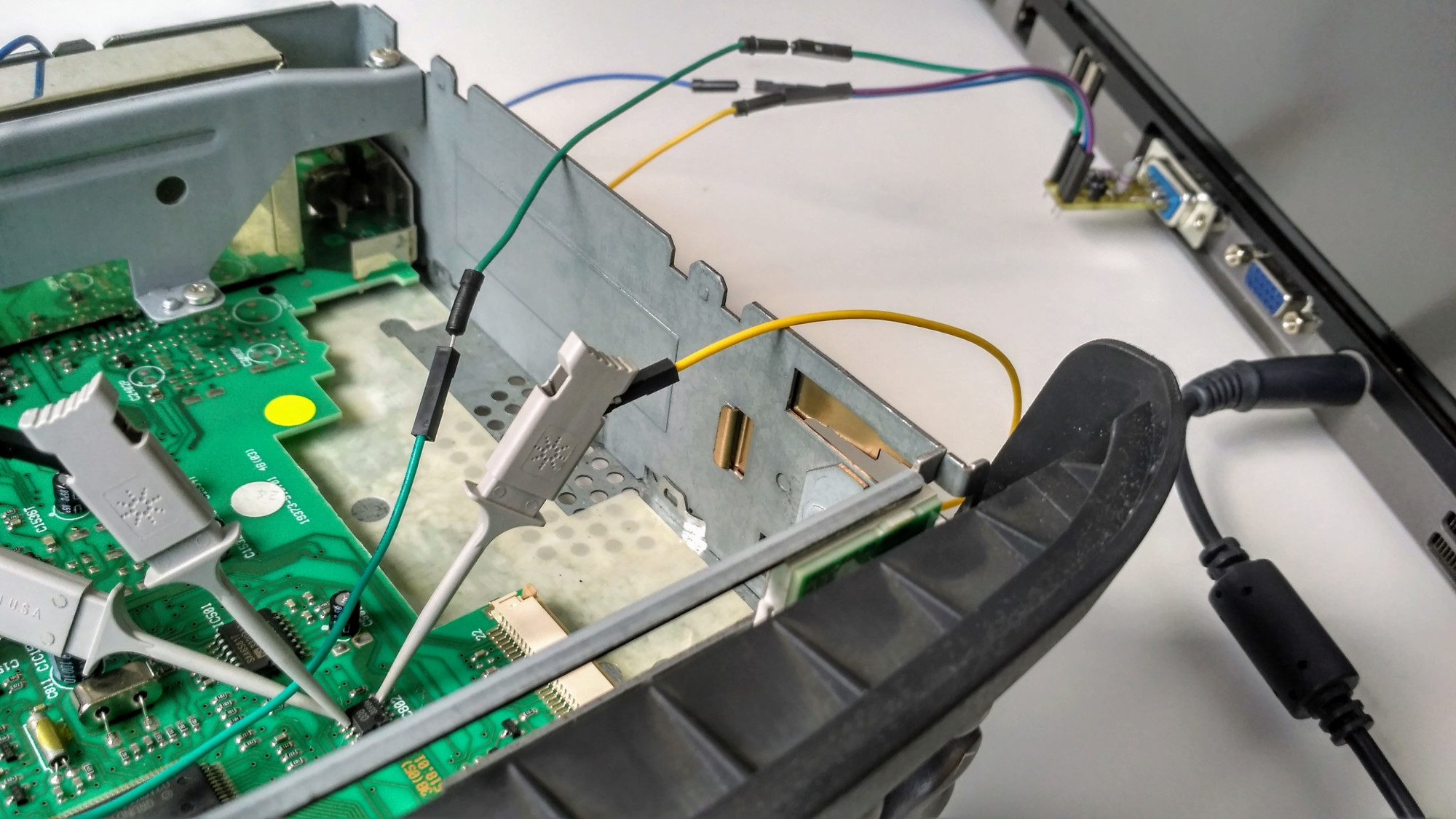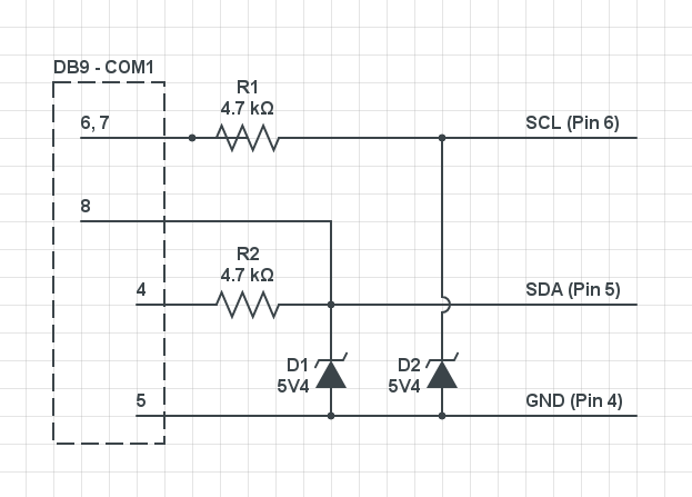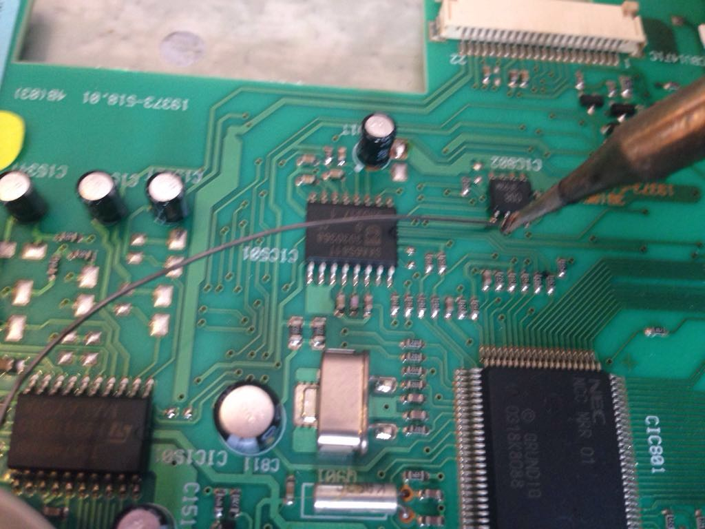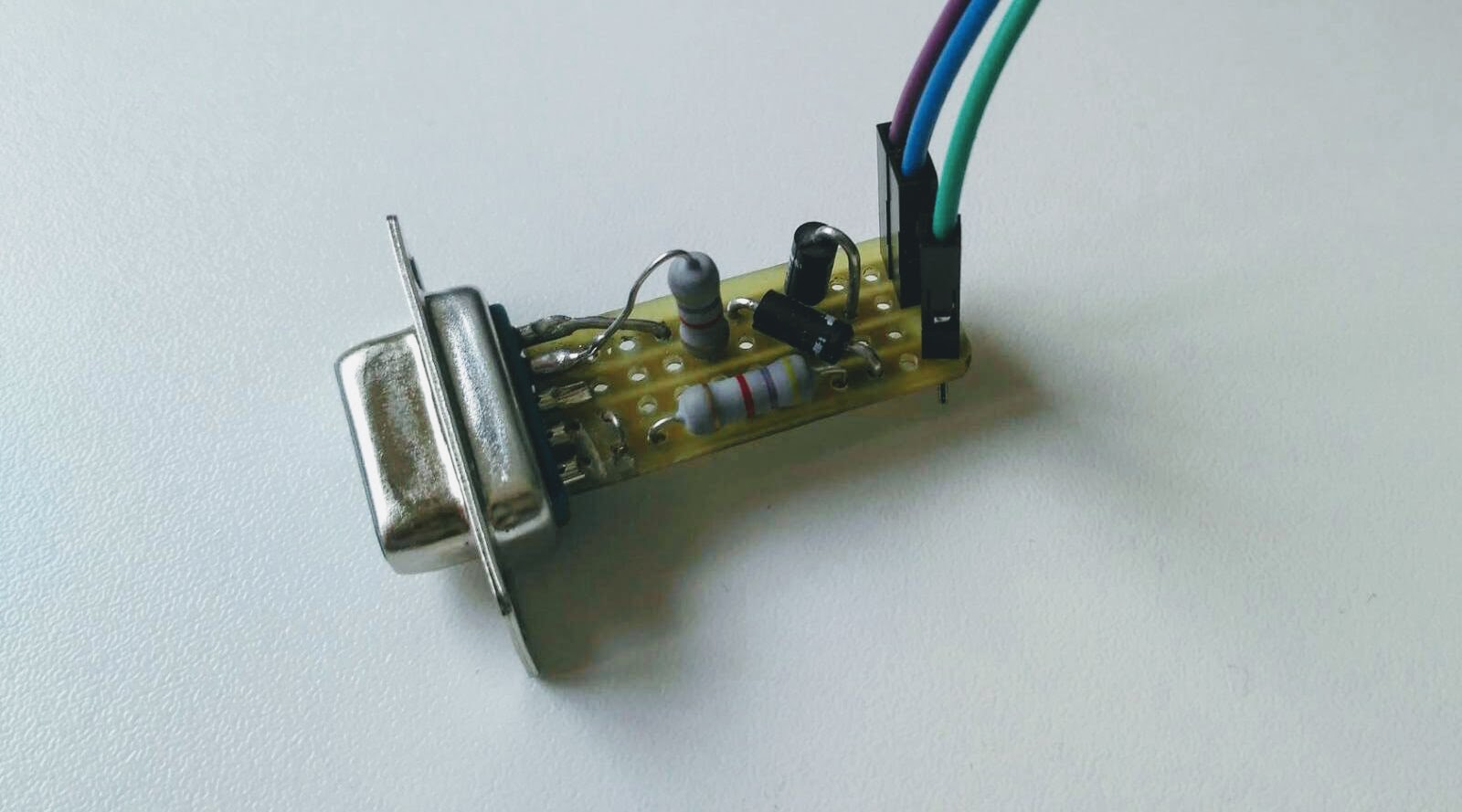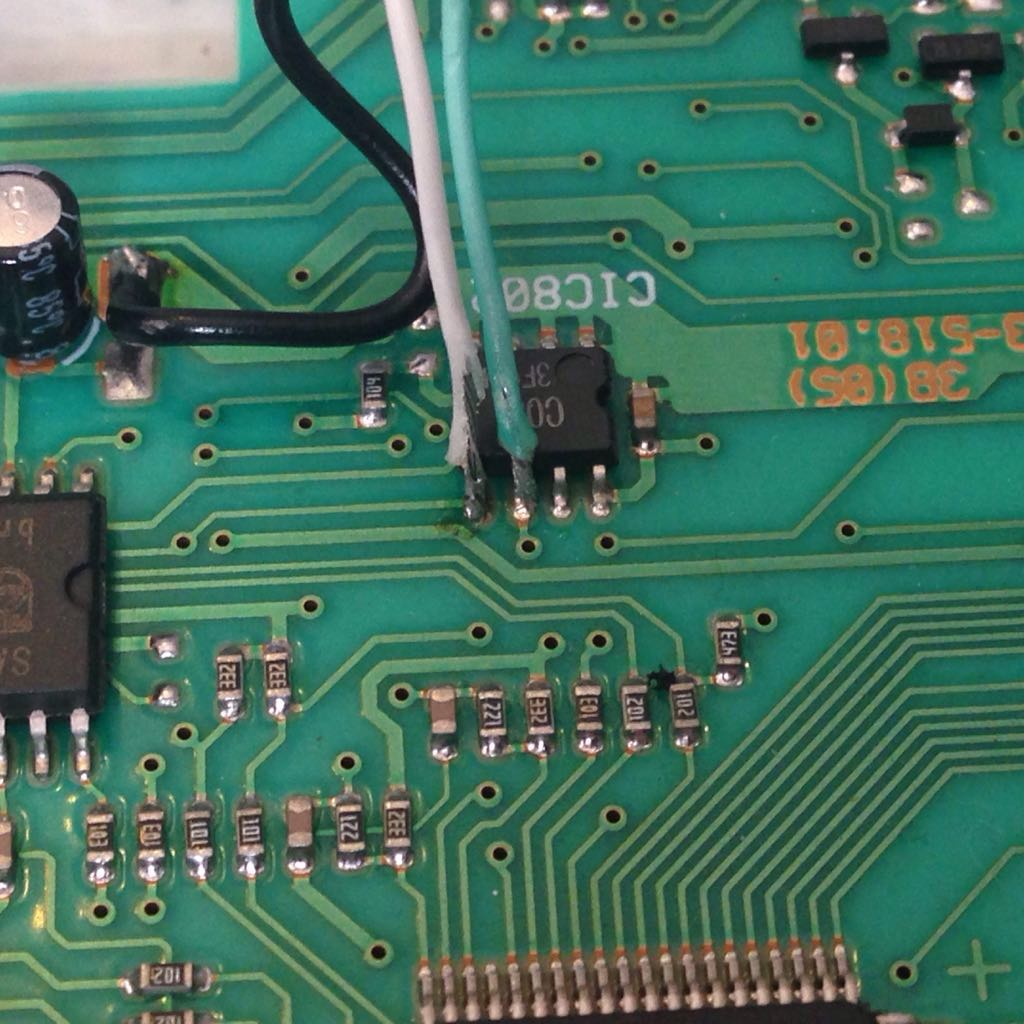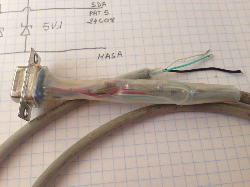Por tanto, tenemos el conector DB9 en un extremo y tres cables que corresponden con SCL, SDA y GND en el otro extremo. Los cables que corresponden a SCL y SDA deberían ser muy finos pues se deben soldar directamente a las patitas de la memoria (que es de tipo SMD). El tercero (la malla) se suelda a masa.