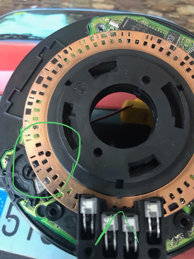 Si continuamos girando dará algo más de media vuelta y notaremos una pequeña resistencia al giro, no hay que forzarlo ya que es la espiral que lleva las señales del airbag y las levas al otro lado, si se forzara podría romperse